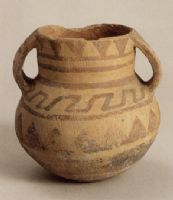 說 明: 泥質(zhì)紅陶.器表用黑彩繪制出連續(xù)三角鋸齒紋、折角紋等。裝飾華麗而醒目。