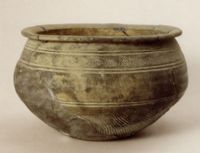 說(shuō) 明: 泥質(zhì)灰黑陶。斂口、沿外卷,圓唇、深腹扁圓鼓。