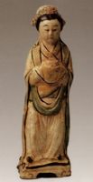 說 明: 瓷俑頭束包髻,圓面細(xì)目,高鼻小口。