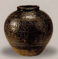 說 明: 施黑釉,刻畫流暢生動.罐呈梯形口,圓腹,臥足.