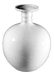 定瓷釉色透明,柔潤媲玉!稓w潛志》提到“定州花瓷甌,顏色天下白。”之外有紅、黑、紫、綠諸色。白定名貴,色定尤為名貴。北宋五大名窯中,唯定窯以裝飾見長。定瓷素有“白如玉,薄如紙,聲如磬”之譽(yù)。用陳大師的話來解釋“白如玉”就是講:定瓷釉色為白色,緊密細(xì)膩,定瓷釉為無色透明釉,兩相結(jié)合,如玉般潔麗柔和,極富流動靈美之感。“薄如紙”是指定窯盤、碗類均以薄為格調(diào),幾乎不薄不為定,一件八寸花口深盤不足六兩,是其它一般瓷器無法比擬的。“聲如磬”謂叩擊瓷器會發(fā)出如磬般聲音,這因為其燒成溫度高奠定了先決條件,加工考究的定瓷胎骨在高溫下的瓷化程度達(dá)到至佳,故其土石聲一躍而為金石聲。陳大師講定瓷另一個最直觀的特點(diǎn)就是裝飾,其裝飾以花紋為最,不同以彩色釉為裝飾的陶瓷,更有別于現(xiàn)代的彩繪花瓷。它主要有刻花、剔花、劃花、堆花等,都是以藝術(shù)性為前提的手工刀刻裝飾。任花鳥魚蟲、人物、山水等大千世界皆能賦予其中,有一定的發(fā)揮性和可控性,更強(qiáng)調(diào)作者的藝術(shù)才華及修養(yǎng)。陳文增大師的每件作品無不體現(xiàn)上述風(fēng)格及特長。