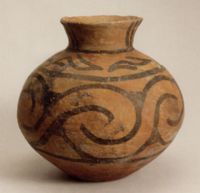 說 明: 泥質(zhì)褐陶.通體施紅色陶衣,用黑彩在腹部繪出旋渦紋.