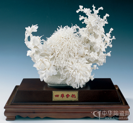 《四季爭(zhēng)艷》長(zhǎng)39cm,寬18cm,高34cm,以德化特有的溫潤(rùn)如玉的“中國(guó)白”為胎質(zhì),潔白細(xì)膩,素凈淡雅。作品主要通過(guò)牡丹、梅花、菊花等蘊(yùn)含傳統(tǒng)美好意愿的花卉來(lái)表現(xiàn),每一朵瓷花都可以以假亂真,每一朵瓷花的盛開(kāi)過(guò)程都是一種神奇,都是對(duì)生命的禮贊。四季的結(jié)合更彰顯出生命的繁華與生機(jī),表達(dá)了對(duì)生活的熱愛(ài)之情。(蘇曉霞)