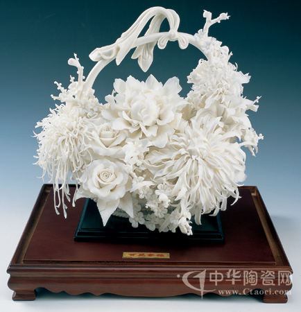 作品采用德化特有的“白如雪、潤如玉、透如絹”的優(yōu)質(zhì)瓷泥,以花籃為載體,以牡丹、菊花、玫瑰為題材,表達了人們對美好生活的追求。牡丹、菊花等都是富貴吉祥的象征,是中華民族傳統(tǒng)文化的情結,周秀燕在傳統(tǒng)的技術基礎上結合這一傳統(tǒng)意蘊,滿載一籃星輝,幸福滿溢。(蘇曉霞)