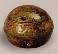 說 明: 胎質較粗,釉色黃綠相間、相互浸漬。
