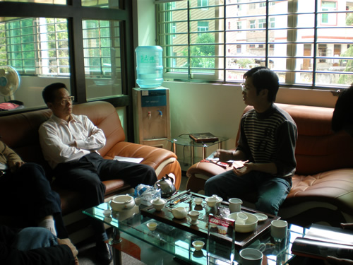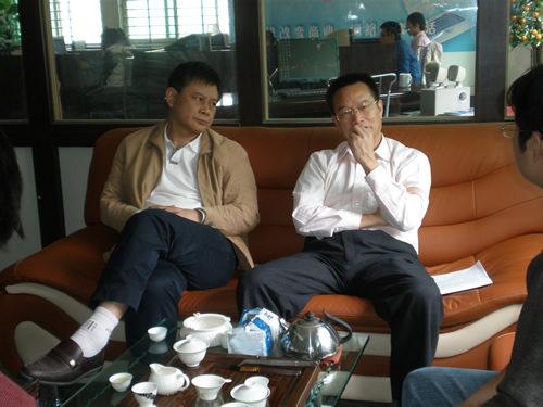 中華陶瓷網(wǎng)總經(jīng)理柯維太(右) 向州市科技局黨組成員、紀(jì)檢組長——陳嘉祐(左)介紹