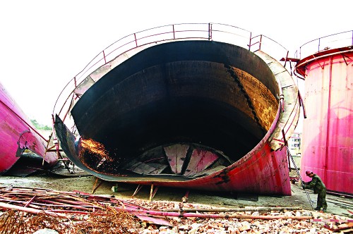 工人正在切割陶瓷廠用來裝重油的油庫,幾個巨大的油庫可見這個陶瓷廠的規(guī)模很大