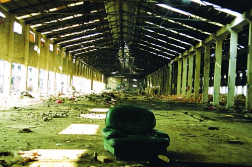 空曠的廠房內(nèi)只剩下一個守廠工人坐的沙發(fā)。廠內(nèi)設(shè)備拆完后,廠房馬上也要拆除了