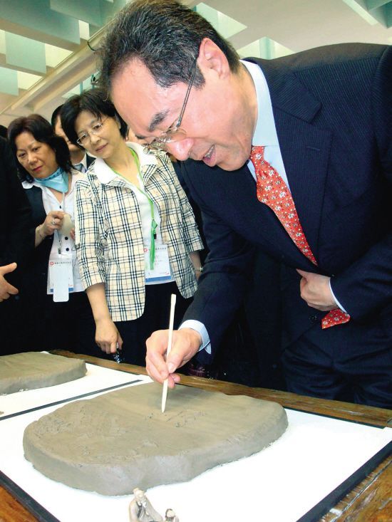 在創(chuàng)意產(chǎn)業(yè)園內(nèi)一幅主題為“珠三角之夢(mèng)”的陶瓷制作的地圖旁,唐英年應(yīng)邀在陶坯上刻下“創(chuàng)意無(wú)限”四個(gè)大字。