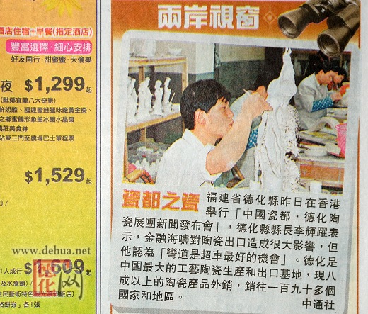 星島日報21日訊,福建省德化縣日前在香港舉行“中國瓷都·德化陶瓷展團新聞發(fā)布會”,德化縣縣長李輝躍表示,金融海嘯對陶瓷出口造成很大影響,但他認為“彎道是超車最好的機會”。