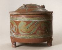 說 明: 器身以醬黃色為底襯,繪刻出弦紋,并用綠彩會出卷云紋,這件陶奩紋飾流暢,色彩絢麗,制作精細(xì)。