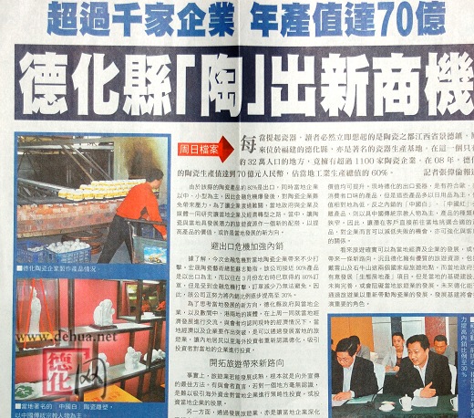 每當(dāng)提起瓷器,讀者必然立即想起的是陶瓷之都江西省景德鎮(zhèn),原來(lái)位于福建的德化縣,亦是著名的瓷器生產(chǎn)基地。在這一個(gè)只有約32萬(wàn)人口的地方,竟擁有超過(guò)1100家陶瓷企業(yè)。在08年,德化的陶瓷生產(chǎn)值達(dá)到70億元人民幣,占當(dāng)?shù)毓I(yè)生產(chǎn)總值的60%。