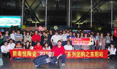 5月8日晚,頭戴神氣的西部牛仔帽、佩帶醒目的嘉賓證,一支200余人的旅行團(tuán)在廣州白云機(jī)場(chǎng)引起了人們的強(qiáng)烈關(guān)注。他們?cè)谑峙e"新南悅陶瓷"導(dǎo)乘牌禮儀小姐的引導(dǎo)下,井然有序地排隊(duì)集合,臉上難掩興奮的喜悅之情。他們就是新南悅陶瓷"祝福中國(guó)"系列團(tuán)購(gòu)活動(dòng)溫州、東陽(yáng)兩地的業(yè)主。據(jù)了解,這是由佛山新南悅陶瓷聯(lián)合溫州興宏陶瓷有限公司和東陽(yáng)興隆陶瓷有限公司聯(lián)合推出的大型陶瓷團(tuán)購(gòu)活動(dòng),旨在慶祝興宏陶瓷、興隆陶瓷成立25周年,同時(shí)也是與新南悅陶瓷攜手走過(guò)十周輝煌歷程的最好紀(jì)念。