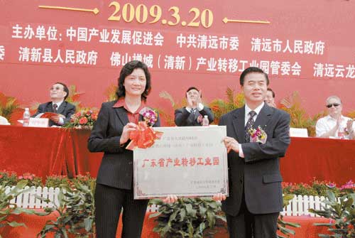 3月20日,全國(guó)陶瓷產(chǎn)業(yè)轉(zhuǎn)移示范基地在廣東清遠(yuǎn)市清新縣奠基。冠星是首批入駐的企業(yè)。圖為廣東省省長(zhǎng)黃華華向清遠(yuǎn)市市長(zhǎng)徐萍華授牌。