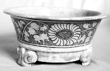 這尊孔雀藍(lán)香爐產(chǎn)自明代早期磁州窯。孔雀藍(lán)香爐為出土之物。高7厘米,直徑14厘米,爐內(nèi)外均施孔雀藍(lán)釉,厚唇,爐身朝外自然敞開(kāi),呈喇叭狀,爐身盛開(kāi)三朵黑釉葵花,視覺(jué)效果突出,四周配上莖葉,主次分明,畫(huà)面剩余空白處采用席紋補(bǔ)白,筆意流暢,構(gòu)圖精巧。香爐圓底露胎,留有修胎的痕跡;爐腰下有凸起圈,圈下外裝飾三只浮雕型如意足,特色鮮明,十分大氣。
