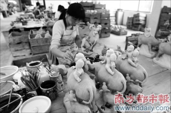 我本來是在石灣灣江藝術(shù)陶瓷廠工作的,1997年佛陶集團重組,就被納入了美術(shù)陶瓷廠。2003年我44歲時,被評上中國陶瓷藝術(shù)大師,是入選國家級陶藝大師中最年輕的。在美陶廠工作,老前輩比較多,大家經(jīng)常交流,他們也會給我提意見。而每年我們同題操作的題目就是做生肖公仔,每人做數(shù)款,然后大家評價再選一些款式投產(chǎn)。