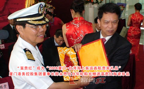 2009年4月8日,為構(gòu)建職業(yè)教育交流平臺(tái),促進(jìn)兩岸經(jīng)濟(jì)文化雙贏,由第十三屆臺(tái)交會(huì)組委會(huì)、福建省中華職業(yè)教育社、臺(tái)灣教育會(huì)、廈門市政協(xié)教科文委和廈門市教育局等主辦的2009海峽兩岸高等職業(yè)教育展覽會(huì)在廈門會(huì)展中心開(kāi)幕,共有來(lái)自海峽兩岸的100余所高等職業(yè)院校參展。全國(guó)政協(xié)常委、港澳臺(tái)僑委員會(huì)副主任陳明義,福建省委常委、廈門市委書記何立峰,全國(guó)人大常委林強(qiáng)等領(lǐng)導(dǎo)出席了開(kāi)幕儀式。富貴紅珍品《小金瓶》成為本次展覽會(huì)唯一指定禮品。2009年4月22日,廈門—臺(tái)灣海上客運(yùn)首航儀式在廈門市海峽郵輪中心舉行。福建省委常委、廈門市委書記何立峰,海峽兩岸航運(yùn)交流協(xié)會(huì)理事長(zhǎng)胡漢湘,臺(tái)灣航業(yè)股份有限公司董事長(zhǎng)張義源等出席了啟動(dòng)儀式。儀式結(jié)束后,有關(guān)領(lǐng)導(dǎo)和人士共同轉(zhuǎn)動(dòng)起航航舵,臺(tái)華輪正式起航,開(kāi)啟了廈門對(duì)臺(tái)滾裝客運(yùn)的新篇章。富貴紅珍品《福祿連枝》、《觀月聽(tīng)潮》成為本次活動(dòng)的貴賓禮品。