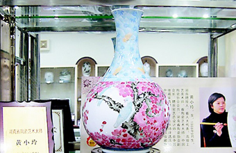 黃小玲大師獲授權(quán)后,設(shè)計出 《和平之春》花瓶圖案:鮮艷盛開的梅花叢中,兩只和平鴿相視而鳴。作品視覺效果清新、明快、典雅,胎坯薄而白,可和玉媲美。