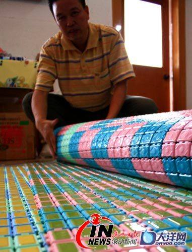 今天,在凌年生的家里,記者看到了凌年生自己制作的組合式瓷片涼席的成品,這種組合式瓷片涼席色彩艷麗,鋪在地上顯得格外吸引人,用手摸一摸感覺很涼爽舒適。凌年生的家里堆滿了制作組合式?jīng)鱿拇善退芰夏K,他告訴記者,他現(xiàn)在自費讓一個廠家?guī)兔ψ鋈菁{瓷片的塑料模塊,然后自己動手把瓷片鑲嵌進去。