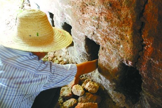 貓身鉆進(jìn)窯洞,首先感到一陣清涼。窯洞呈半橢圓形,長(zhǎng)約6米,寬約3米,最高處約6米,是用一塊塊巨大的青磚壘成,呈螺旋狀,非常有特色。窯前分布著15個(gè)通火孔,四周是一層厚厚的窯漢,堅(jiān)硬異常。
