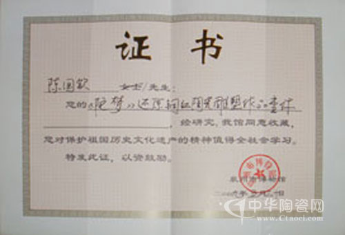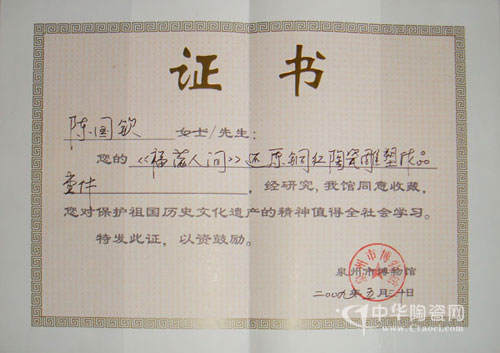 《陀夢》福建中國閩臺緣博物館收藏證書