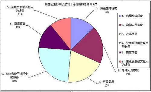 而具體到是哪些因素影響了對于經銷商的總體評價,24%的網友表示是安裝和使用過程中的服務影響了他們對于經銷商的評價,產品品質作為一個重要因素占到了20%的比例,而作為與顧客的直接接觸者,導購人員的態(tài)度占了19%,此外,商家信譽和店面整潔度各自占有13%的比重,而親戚朋友或者其他人的評價占到11%的比重,口碑傳播是陶瓷衛(wèi)浴產品選購的一個重要決定因素。