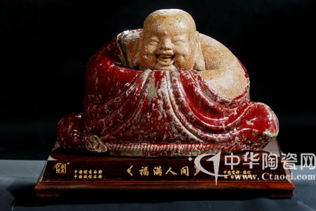 據(jù)陳國(guó)欽先生介紹,《福滿人間》是戴云藝瓷窯變工藝的代表作品,是一件還原數(shù)百年前的銅紅釉瓷彌勒佛像,是先用廢棄瓷砂土雕制成型,再在衣飾上施上銅紅釉,再經(jīng)過1310℃—1330℃還原焰高溫窯變燒制而成。所謂窯變是指器物在窯內(nèi)燒制時(shí),由于窯中含有多種呈色元素,經(jīng)氧化或還原,出窯后會(huì)呈現(xiàn)意想不到的釉色效果。