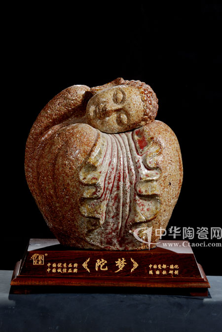 《福滿人間》彌勒佛雕像高28厘米、寬46厘米,雙手?jǐn)n于胸前作揖狀,肌膚顏色為鐵銹黃胎色,衣服為銅紅色與鐵銹黃釉面,笑容可掬,形象古樸。《陀夢(mèng)》佛陀雕像高28厘米、寬26厘米,佛陀雙手?jǐn)n抱托腮作眠狀,衣飾紋理和頭頂肉髻夾雜鐵銹黃與銅紅色釉,面相祥和,似在夢(mèng)中作無限遐想。