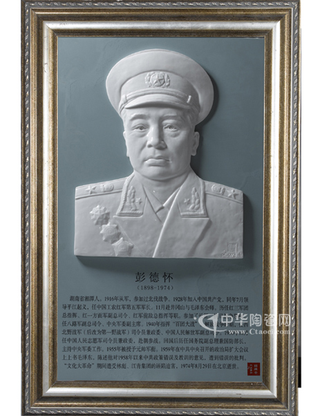 瓷藝大師林建全通過建白瓷獨特創(chuàng)造出彭德懷人物浮雕壁飾,藝術再現了彭德懷老一輩革命家的風采。此浮雕壁飾的厚度只有2-3mm,人物雕塑栩栩如生,技術難度相當高,林建全也是耗費巨資歷經十幾年的不斷探索才研制成功,具有極高的欣賞、收藏價值。而且林建全還創(chuàng)造性地將彭德懷元帥的簡歷,用陶瓷花紙經過低溫燒制附著于作品中,從而使作品充滿濃厚的文化氣息,具有啟迪智慧、警示人生的作用。