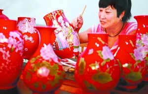 懷柔區(qū)廟城鎮(zhèn)農(nóng)民高林榮開辦的彩繪陶瓷廠,主要生產(chǎn)制作陶瓷中國(guó)紅、臺(tái)燈、花盆、彩瓶、杯碗、飾盒、琺瑯等300多個(gè)品種。這些由農(nóng)民制作的彩繪陶瓷產(chǎn)品,不但供應(yīng)國(guó)內(nèi)市場(chǎng),還銷往美國(guó)、韓國(guó)、加拿大、新加坡等國(guó)家和地區(qū)。圖為農(nóng)家女劉天榮在描繪“中國(guó)紅”陶瓷工藝禮品。