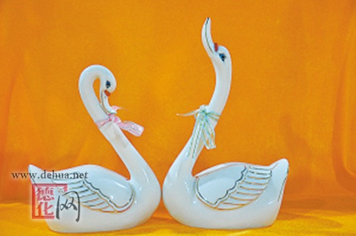 瓷雕“天鵝”,一雌一雄,引頸高歌,造型別致。高分別為19厘米和25厘米,寬為15厘米和16厘米;系高溫?zé),描金、具有實用和欣賞價值。