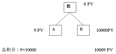 假設(shè):某月你的消費額=0PV(積分);你團隊中A部門的總消費額合計∶9PV;你團隊中B部門的總消費額合計∶10000PV(見下圖),我們來計算一下這種情況下你的獎金應(yīng)該是多少?
