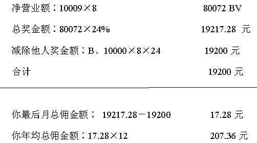 可見∶B部門完成10000PV(24%)要多得有19200元;A部門完成9 PV要少得有0元;你雖然培養(yǎng)了A、B二個部門,一個很大,一個很小,完成了10009PV,但其中的10000PV不是你完成的而是B部門完成的,所以,你不能剝削B部門的收入,雖然你也達到了24%業(yè)績,但你也只能少得有17.28元。這就是多勞多得,少勞少得的傳統(tǒng)公平原則;如果經(jīng)過你的努力,你建立了龐大的部門A、B、C……即使你的業(yè)績?yōu)榱悖]有業(yè)績要求和任何壓力)公司仍然承認你前期的付出而給你回報。這又充分體現(xiàn)了多層次獎金分配制度是按開始:多勞不得;中期多勞少得;后期少勞甚至不勞還可以多得的這樣一個公平的分配原則。這就是多層次直銷獎金分配機制的公平原則,其它原則由于篇幅所限我們在這里不一 一講敘,望讀者見諒!關(guān)于“李記”直銷商業(yè)模式其它的經(jīng)營戰(zhàn)術(shù),我們也不一 一再講述,這一點也請讀者多多見諒!