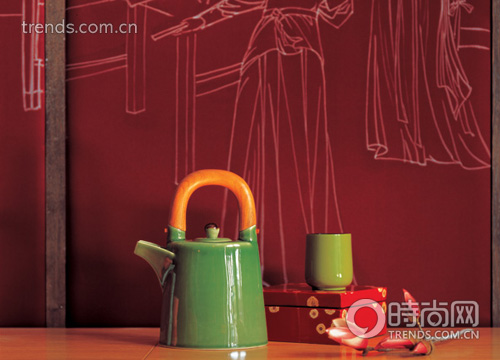 竹節(jié)手柄配合清新的綠色茶壺,在紅色背景襯托下,讓東方的釉色更顯清爽自然。