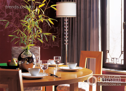 金屬銀色的花瓶比青釉瓷瓶更多了份時尚感。在濃墨重彩的墻面白描的映襯下,青竹以質(zhì)樸的美感降低了色彩的飽和度,讓餐廳色調(diào)清新宜人。