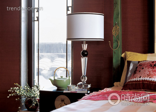 用中式的木箱作為床頭柜,在紅色背景中搭配現(xiàn)代造型的臺燈,細節(jié)中強調(diào)了精致與實用。
