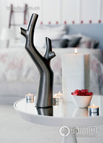 盛滿紅色糖果的骨瓷碗,搭配白色蠟燭與現(xiàn)代感十足的樹形花瓶,冷色中的一抹紅色格外打眼。燭光下,方形蠟燭肅靜的單純讓空間充滿古典的純凈意味。