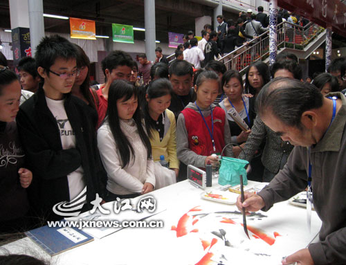 最吸引人的展廳在哪里?根據(jù)記者上午的觀察,是那些提供了現(xiàn)場展示的地方。76歲的繪畫大師揮毫潑墨、年輕漂亮的禮儀表演茶藝、吉州窯展區(qū)的現(xiàn)場制瓷……與以往靜態(tài)展示陶瓷和繪畫作品不同,在今年的瓷博會上,不少參展商別出心裁地上演“真人秀”,成功吸引參觀者的目光。