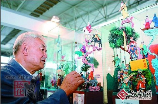 匯聚雕刻、編織刺繡、服飾、奇石玉器、新型工藝品等11個門類的民博會在昆明國際會展中心開展,來自云南省的60余位民間非物質(zhì)文化遺產(chǎn)傳承人展示以上絕活絕技。今年的民博會逐漸與國際化接軌,不僅吸引了來自國內(nèi)的客商,來自阿富汗和斯里蘭卡的國外客商也遠(yuǎn)道參展。圖為通?h民族民間藝人姜增福首創(chuàng)的面塑高臺栩栩如生。