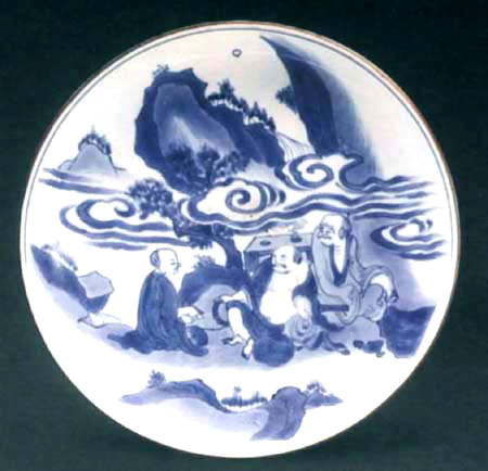 盤敞口,口沿施醬釉,弧壁,圈足略高,足內(nèi)青花寫有“玉堂佳器”四字楷書款?谘乇≈恋撞恐饾u增厚,白釉泛青,青花艷麗,外壁光素?zé)o紋,盤內(nèi)繪三個(gè)老和尚席地而坐,一和尚手拿樹葉,一和尚手拿佛珠,另一和尚手拿撲扇,身前立一老虎,人物周圍襯以山石、松樹、花草紋,空中繪流云、月亮,人物姿態(tài)各異,形象生動(dòng)逼真,構(gòu)圖新穎別致。