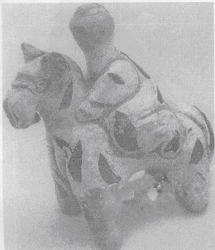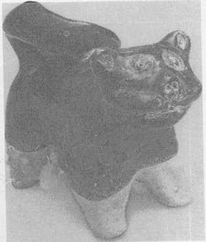 3.畫風畫法。吉州窯古陶瓷裝飾,無論是剪紙還是彩繪,講究簡練的畫風畫法和疏朗有致的圖案布局,往往寥寥數筆勾勒成形,或點綴幾筆以打破平面,極其寫意又十分傳神(圖3),絕無文人騷客筆下的山水人物、花鳥蟲魚,即使同畫梅花也別具一格。其圖案均源于自然,取自民俗生活,多以自然物為對象,如菱花(圖4)、團花、梅花、梅枝、蕉葉、奔鹿(圖5)、彩蝶、波濤、貓、狗、虎(圖6)、馬(圖7)、蟲、魚,常見“金玉滿堂”(圖8)、“長命富貴"、“龜鶴齊壽”、“兒孫滿堂”、“多子多福”、“金桂玉蘭”等吉祥語剪紙,還有馬上猴(寓立刻封侯意)、凳上猴(圖9)等彩繪泥塑瓷。這些裝飾圖案質樸明快、童趣盎然,民俗理語特點鮮明,濃烈的生活氣息撲面而來。