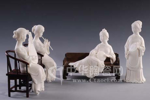 《江南絲竹》以德化特有的“中國(guó)白”為原料,潔白透亮、如脂似玉,淋漓盡致地表現(xiàn)出了江南女子的溫柔、秀美,極具欣賞價(jià)值。作品中四個(gè)江南女子或坐、或立、或躺,或持扇、或彈琵琶、或吹笛子,讓人感覺(jué)像小橋流水,亦像是一曲婉約的小曲,讓人產(chǎn)生很多的遐想:人在白墻灰瓦的大院里面,聽(tīng)著音樂(lè),悠閑自在,表現(xiàn)人生活狀態(tài)的一種場(chǎng)景。