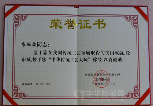 2009年12月,鑒于陳國(guó)欽在我國(guó)傳統(tǒng)工藝領(lǐng)域取得的突出成就,經(jīng)審核,全國(guó)促進(jìn)傳統(tǒng)文化發(fā)展工程授予陳國(guó)欽“中國(guó)傳統(tǒng)工藝大師”稱號(hào)。(小俠、小米)