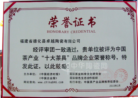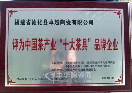2010年1月23日,中國首屆茶企總裁(CEO)高峰論壇暨中國茶產(chǎn)業(yè)經(jīng)濟(jì)人物與品牌企業(yè)頒獎(jiǎng)典禮于廈門萬壽賓館隆重舉行。福建德化卓越陶瓷有限公司榮獲中國茶產(chǎn)業(yè)“十大茶具”品牌企業(yè)榮譽(yù)稱號(hào)。這是實(shí)力的見證,也是對(duì)卓越陶瓷多年來的努力以及為茶具行業(yè)做出貢獻(xiàn)的極大肯定。