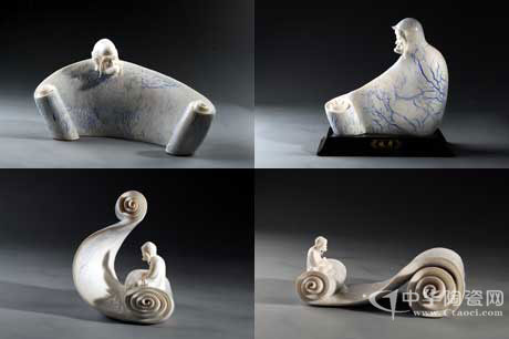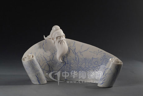 面對(duì)如此豐富的陶瓷語言,徐才提更是獨(dú)家采用窯變青花為背景,與“中國白”瓷塑相結(jié)合!段颉废盗、《達(dá)摩》系列、《三十六計(jì)》系列、《孔子》等作品,就是最好的例證。窯變青花釉透過瓷塑更增添內(nèi)涵,看似普通的藍(lán)色,在這里便被賦予深刻的內(nèi)涵,猶如大海般的淵博知識(shí),一道道可遇不可求的窯變裂紋,也猶如象征著“大千世界,千變?nèi)f化,功到自然成”的禪宗思想。瓷塑人物智慧等形象通過內(nèi)涵豐富的窯變青花釉表現(xiàn)得更加飽滿、淋漓盡致,兩者遙相呼應(yīng),相得益彰。