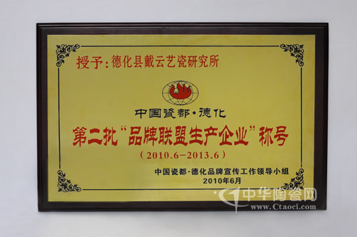 2010年6月4日,德化縣戴云藝瓷研究所被中國瓷都•德化品牌宣傳工作領(lǐng)導(dǎo)小組評為中國瓷都•德化第二批“品牌聯(lián)盟生產(chǎn)企業(yè)”榮譽(yù)稱號(hào)。這是對戴云藝瓷多年來持續(xù)堅(jiān)持以潛心探討藝術(shù)為本,不斷追求瓷業(yè)的新境界的肯定與鼓勵(lì),相信戴云藝瓷之路將越走越穩(wěn),越走越遠(yuǎn)。(蘇曉霞)