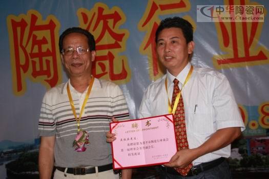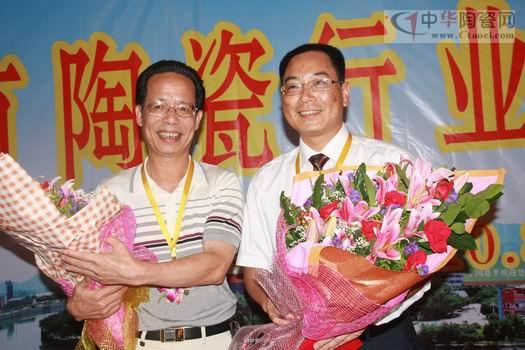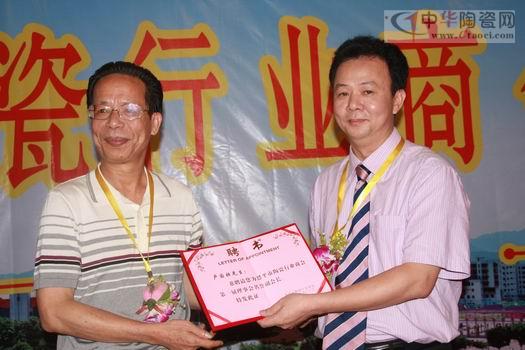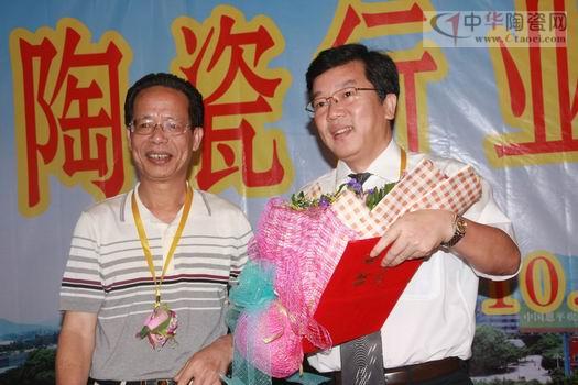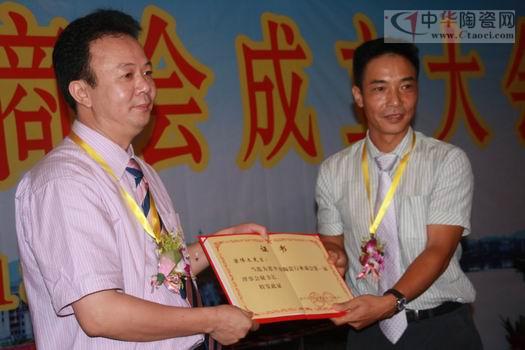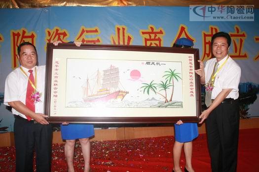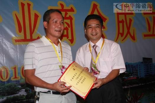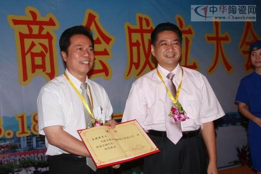 恩平市工商聯(lián)(總商會)主席張活林代表市工商聯(lián)(總商會)向恩平市陶瓷行業(yè)商會頒授牌匾,恩平市陶瓷行業(yè)商會第一屆理事會會長葉榮崧代表恩平市陶瓷行業(yè)商會接受牌匾。