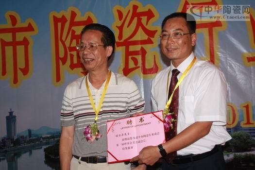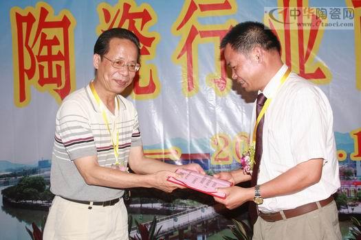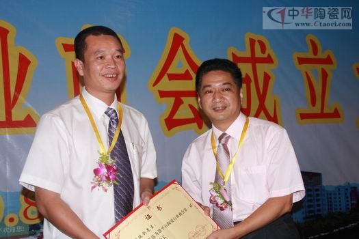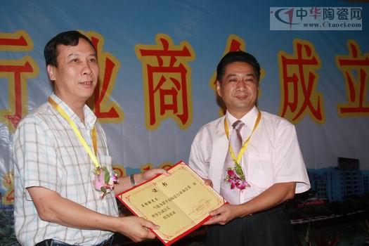 恩平市委書記、市人大常委會主任魏志平為當選的市陶瓷行業(yè)商會第一屆理事會會長葉榮崧頒發(fā)證書。