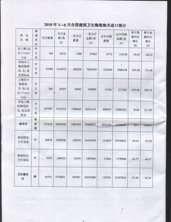2010年1—6月全國(guó)建筑衛(wèi)生陶瓷海關(guān)進(jìn)口統(tǒng)計(jì)