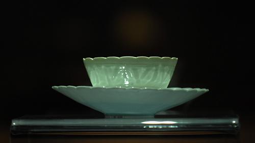 圖為展出的一件隨“南海一號”打撈出水、由國家博物館館藏的宋青白釉葉脈紋芒口碗及葉脈紋淺腹盤(10月2日攝)。